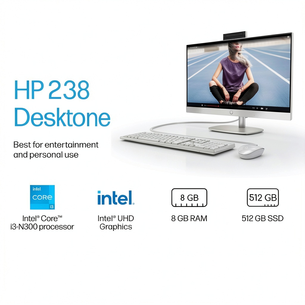The HP 23.8-inch Full HD touchscreen all-in-one computer integrates a high-performance Intel Core i3 N300 processor, 8GB of memory, and a 512GB SSD into a sleek shell white chassis. This model features a vibrant 23.8-inch display with full HD resolution and responsive touch capabilities, designed for efficient daily computing. Built with durable materials and modern craftsmanship, it offers a compact footprint that reduces clutter while delivering reliable speed and storage for diverse applications.